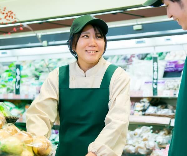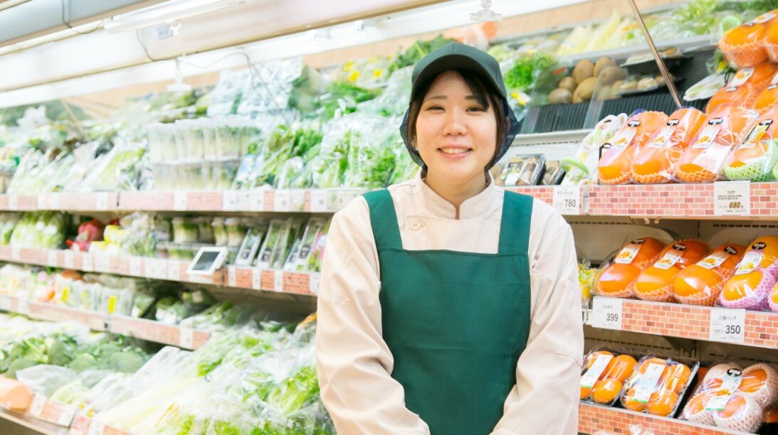 短大生の頃にレジバイトをしていた経験から、卒業後に当社の登用試験を受け、契約社員・正社員と少しずつキャリアアップしました。契約社員の頃には、レジ部門のみならず、惣菜やグロサリーなどの手伝いも行ったため、様々な部門の経験を積むことができました。正社員になる際に正式に青果部門に配属され、現在は、大型店の青果チーフを任されています。