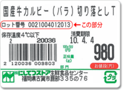 パックシールに表示されているロット番号(13桁)から、10桁の個体識別番号をご確認いただけます。独立行政法人家畜改良センターのホームページで「牛の個体識別情報の検索サービス」をご利用ください。